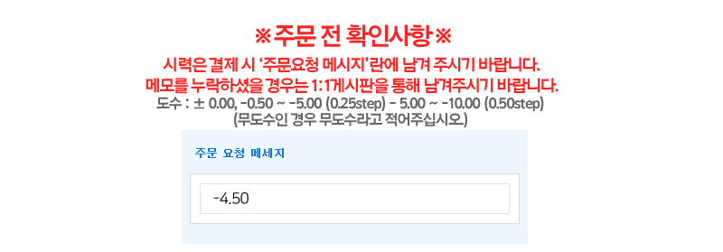 | 도수 | ± 0.00, -0.50 ~ -5.00 (0.25step) - 5.00 ~ -10.00 (0.50step) |